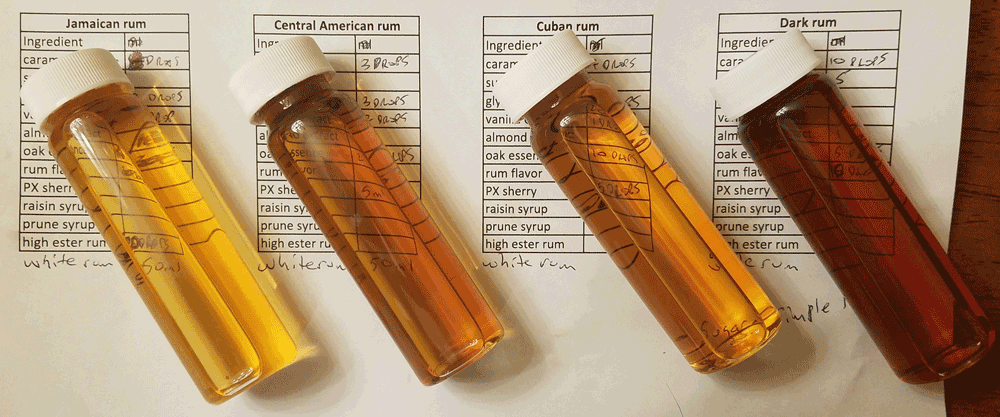 To this base rum we’ll systematically add various blending ingredients to try and achieve the appearance and flavor profile of different aged rums.